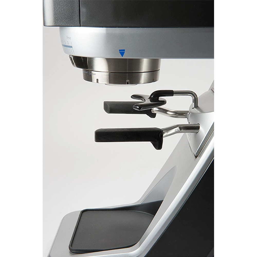 In das eingebaute, verstellbare Haltesystem können Sie sowohl Ihren Siebträger als auch den mitgelieferten Auffangbehälter oder auch die Behälter der gängigsten Brühsysteme (Hario, Clever, Able Kone) einsetzen und direkt hinein vermahlen. Für einen sicheren Sitz werden die Siebträger zusätzlich mit dem eingebauten Haken fixiert.