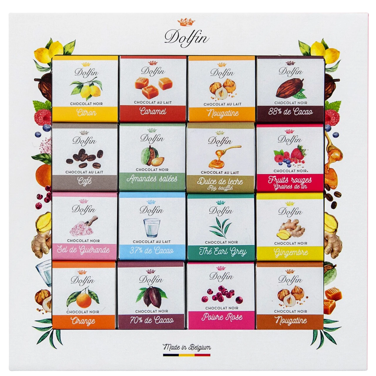 In der dekorativen Verpackung befinden sich 16 leckere Sorten à drei Tafeln aus der belgischen Schokoladen-Manufaktur Dolfin. Perfekt zum Verschenken oder selbst genießen.