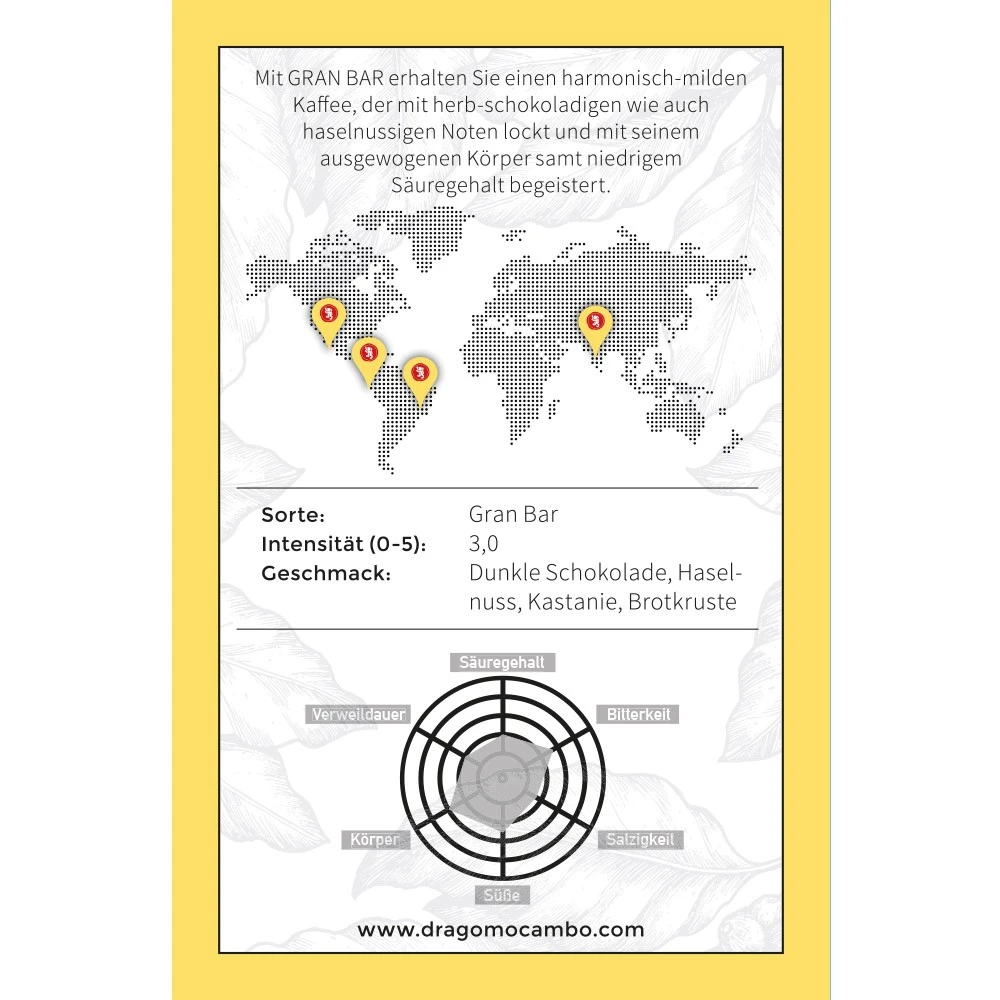 Mocambo Gran Bar besteht aus insgesamt sechs verschiedenen Rohkaffees aus Brasilien, Mittelamerika und Nordafrika. Sie bilden die Grundlage für diesen außergewöhnlich milden Caffè. Etwa 18 Minuten bei 220 °C im klassischen Trommelröstverfahren dauert es, dann ist der Mocambo Gran Bar fertig. Erst nach dem Ausgasen geht es ab in die goldene Tüte, seit jeher das Kennzeichen für die beste Qualität von Mocambo. Geschmacklich haben wir es hier mit einem sehr runden, aromatischen Caffè zu tun, mit schöner Zeichnung in der haselnussfarbigen Crema. Ausdrücklich empfehlen möchten wir Mocambo Gran Bar für die Verwendung als in vollautomatischen Maschinen, z.B. Saeco, Jura oder Krups. Aber auch als weicher Espresso macht die Miscela Gran Bar einen guten Eindruck.