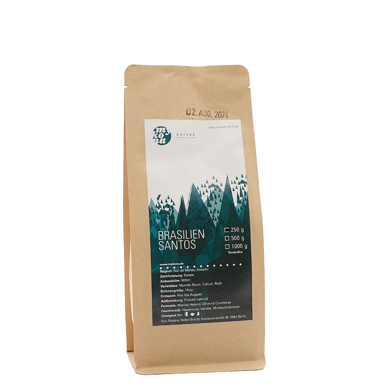 Mykona Brasilien Santos von der Veloso Farm besteht zu 100% aus , ist mild und hat einen weichen, naturmilden Geschmack bei einem geringen Säuregehalt. Er ist daher ein äußerst harmonischer, genussvoller Kaffee, der auch ideal am Morgen zum Frühstück passt.